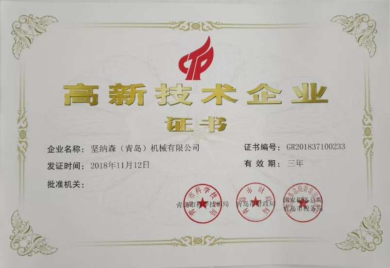 經(jīng)過幾年的努力,堅(jiān)納森(青島)機(jī)械有限公司于2018年通過了青島科技局、財(cái)政局、稅務(wù)局聯(lián)合組織的專家評審,以及國家科技部、財(cái)政部、稅務(wù)總局的復(fù)核,在2018年11月12日獲得由青島科技局、財(cái)政局、稅務(wù)局聯(lián)合頒發(fā)的《高新技術(shù)企業(yè)證書》。